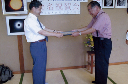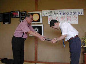 こちらは、NHKのカメラを向けられて 授与式を執り行い中。 望遠鏡の一つくらい用意しておくべき メンバーからShozosatoは地球に落ちて 佐藤会長・・・・ |