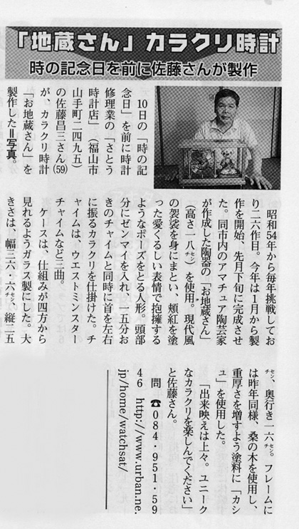ムーブメントはスリーチャイム(3曲)付きのドイツ製です。カラクリを何を使用かと思案していたら趣味で陶器の創作をしている方が今、お地蔵さんが静かなブームだと言う事でカラクリにどうかと勧められ使う事にしました。 最初は頭が前後にガッテンするように製作していたが頭が結構重くてなかなか動かない・・・ 15分毎にチャイムが鳴りお地蔵さんの首(頭)が動く仕掛けです。 佐藤昌三 |
